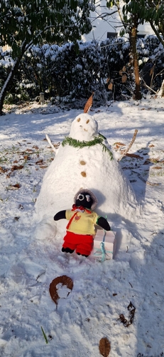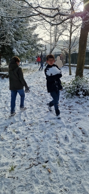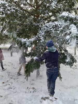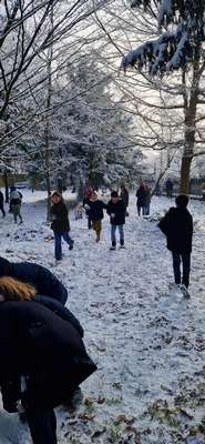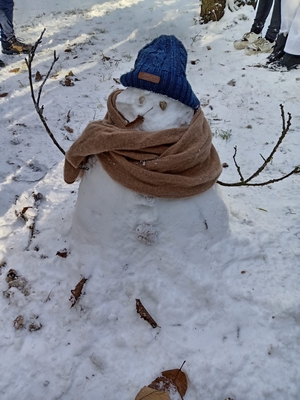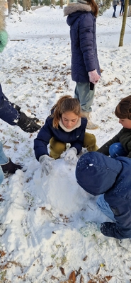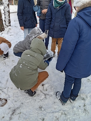 Les élèves de CM2 ont eux aussi pleinement profité de la neige en se rendant dans le sous-bois, où ils ont fabriqué ensemble un bonhomme de neige. Ce moment convivial a favorisé la coopération, la créativité et le plaisir d’être dehors, tout en partageant une expérience joyeuse et fédératrice.